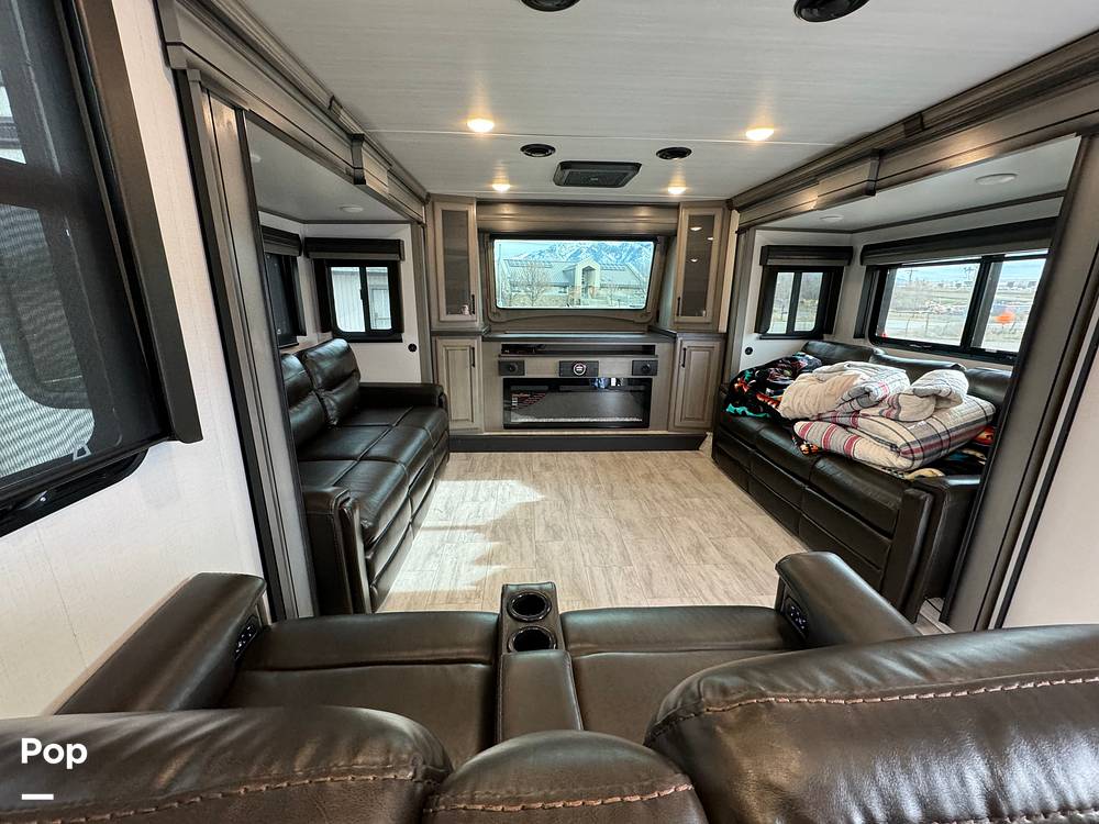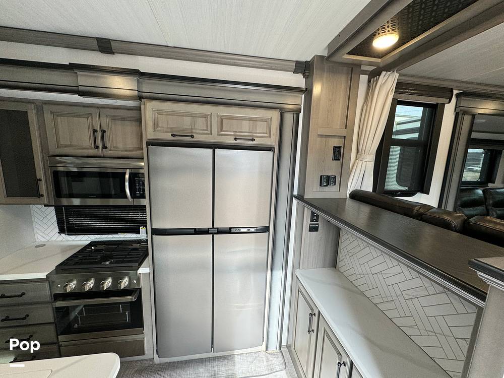Step inside, and you'll be greeted by a luxurious interior that feels just like home. The front living area is perfect for relaxing after a day of exploring, with plush seating and a large entertainment center. The kitchen is fully equipped with modern appliances, ample counter space, and plenty of storage, so you can whip up your favorite meals on the road. The dining area is cozy and inviting, perfect for family dinners or game nights.
