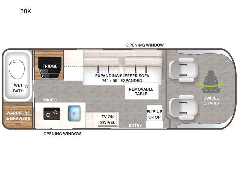 Measuring 18 feet in length, the Tellaro 20K is compact enough to navigate city streets with ease while still providing ample space for all your needs. Its smart layout maximizes every inch, featuring a well-equipped kitchenette, a comfortable sleeping area, and a functional bathroom. The interior is thoughtfully designed with modern finishes and plenty of storage, ensuring you have everything you need for a seamless travel experience.