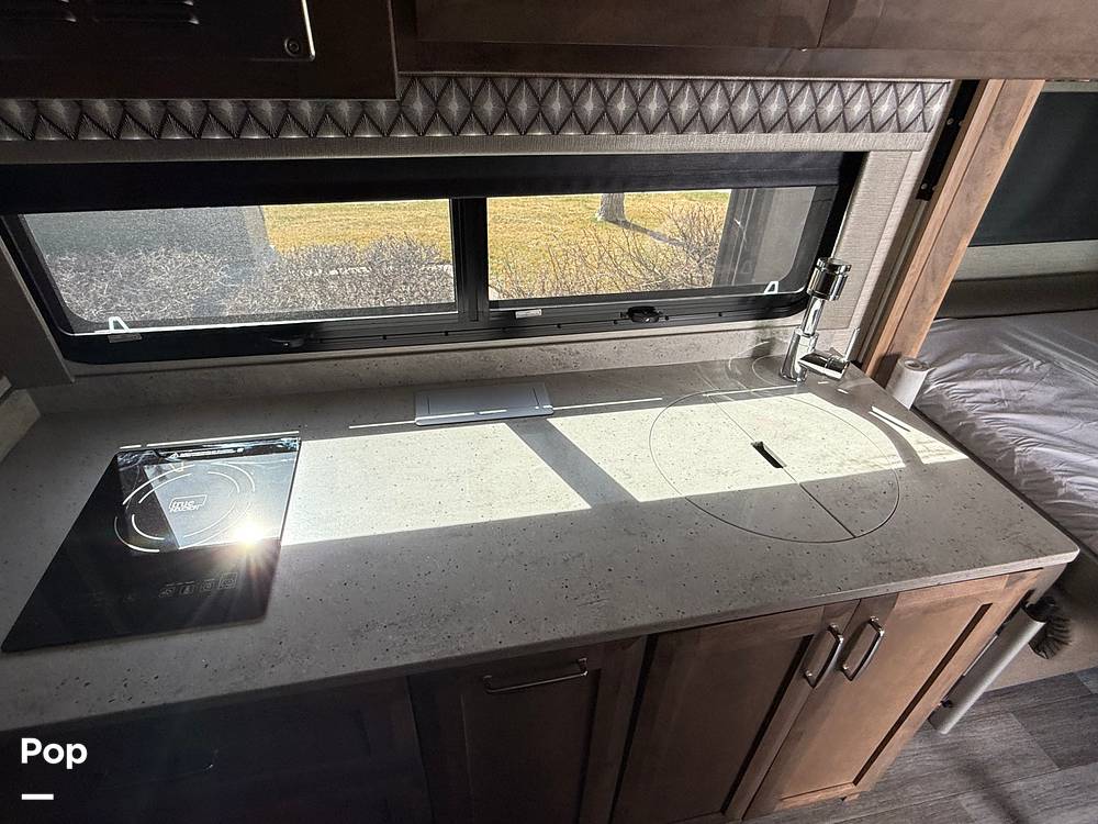 Step inside to discover a thoughtfully designed living space that maximizes comfort and convenience. The Wayfarer features a fully equipped kitchen with modern appliances, allowing you to prepare meals with ease. The cozy sleeping arrangements include a queen-sized bed, convertible dinette, and an overhead bunk, ensuring everyone has a restful night's sleep. The stylish bathroom is complete with a shower, sink, and toilet, providing all the comforts of home on the road.
