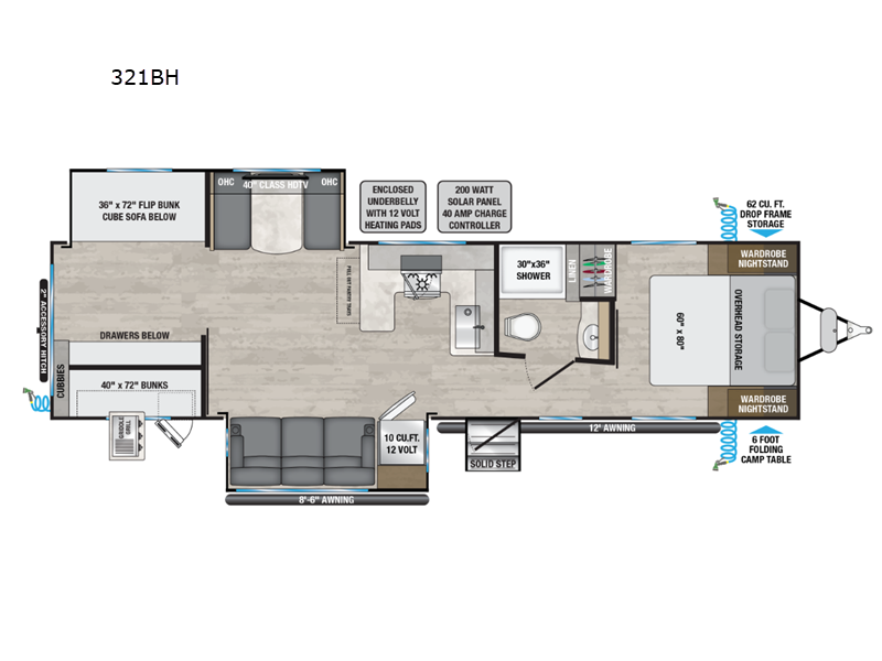 The Delta 321BH features two expansive slide-outs, significantly enhancing the interior space to create a welcoming and spacious environment. This thoughtfully designed layout can comfortably accommodate up to eight individuals, making it ideal for family vacations or group outings. The interior is meticulously crafted with high-quality materials and finishes, offering a harmonious blend of style and practicality. The living area is equipped with modern amenities, including a fully functional kitchen, a cozy dining space, and a relaxing lounge area, ensuring that every moment spent inside is as enjoyable as the adventures outside.