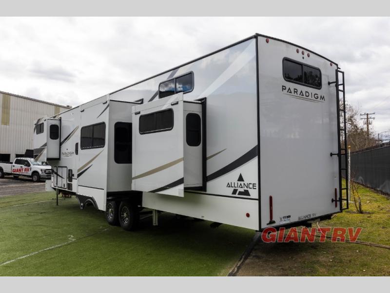 Discover the ultimate in luxury and comfort with the 2024 Alliance RV Paradigm 395DS Fifth Wheel, a masterpiece of modern design and engineering. This stunning RV, measuring an impressive 35 feet in length, is your gateway to unforgettable adventures. With four expansive slide-outs, it offers an unparalleled spaciousness that transforms your travel experience into a home-like retreat. Whether you're planning a family getaway or a road trip with friends, this RV comfortably sleeps up to eight, ensuring everyone enjoys a restful night's sleep.