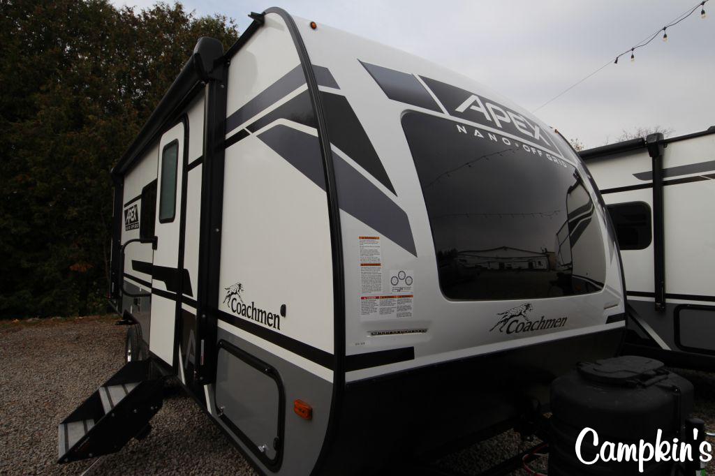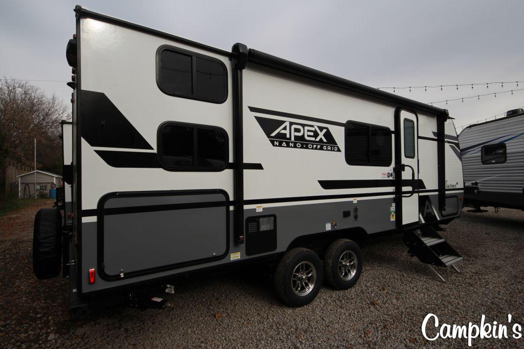 Perfect trailer for the growing family. This Apex Nano 208BHS comes with a queen bed. The large double over double bunks offer extra sleeping space for your growing kids. We are on a dual axle with outside kitchen and still only weighing around 4,200 lbs. Outside grill and mini fridge for convenience.