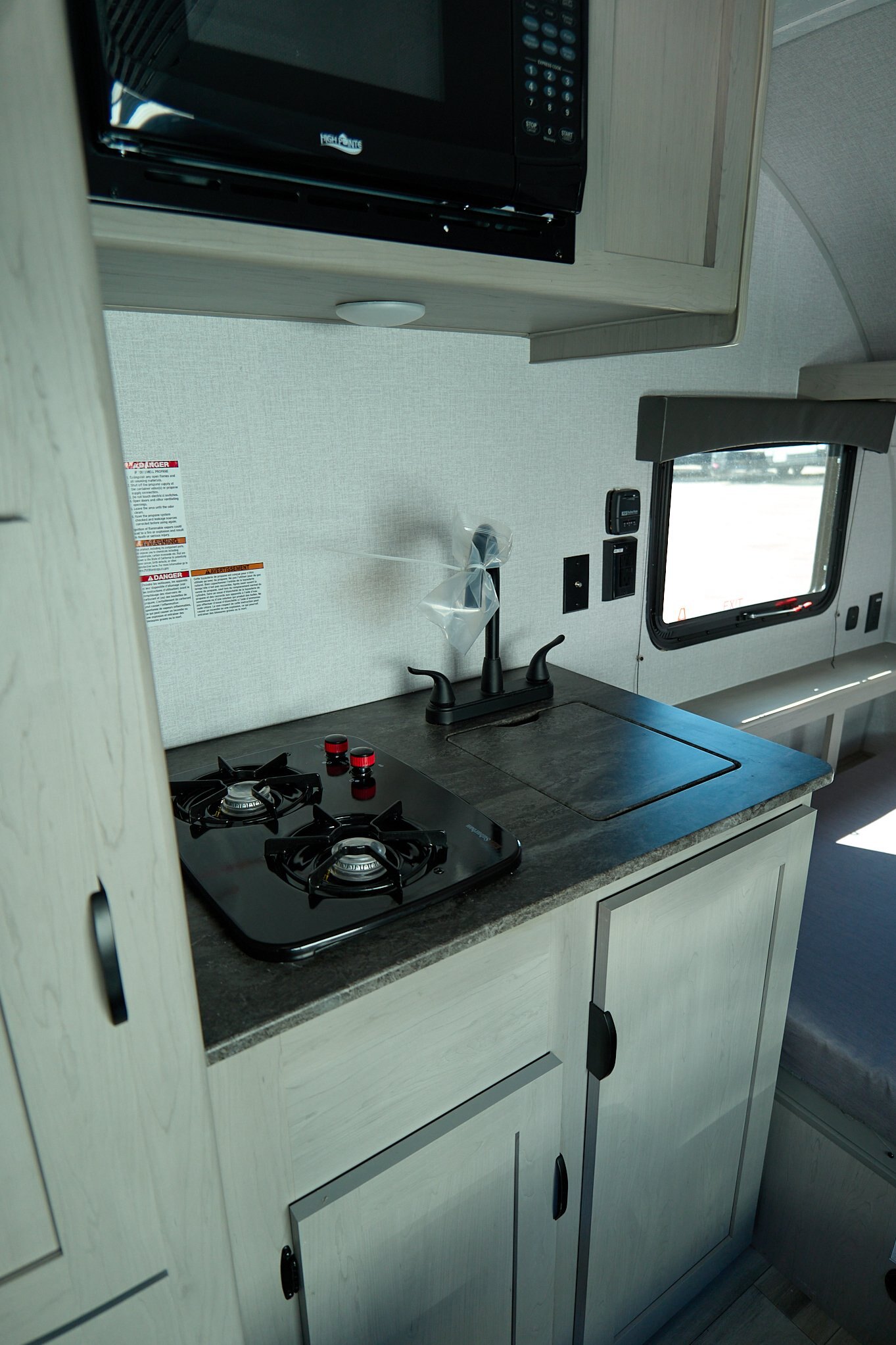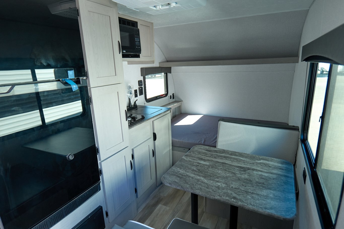 Step inside to find a thoughtfully designed interior that maximizes space and functionality. The cozy sleeping area comfortably accommodates two, ensuring a restful night's sleep after a day of exploration. The fully equipped kitchenette features a two-burner stove, a compact refrigerator, and a microwave, allowing you to prepare your favorite meals with ease. The dinette area, which converts into additional sleeping space, is perfect for enjoying meals or planning your next adventure. With ample storage throughout, you can bring along all your essentials without feeling cramped.