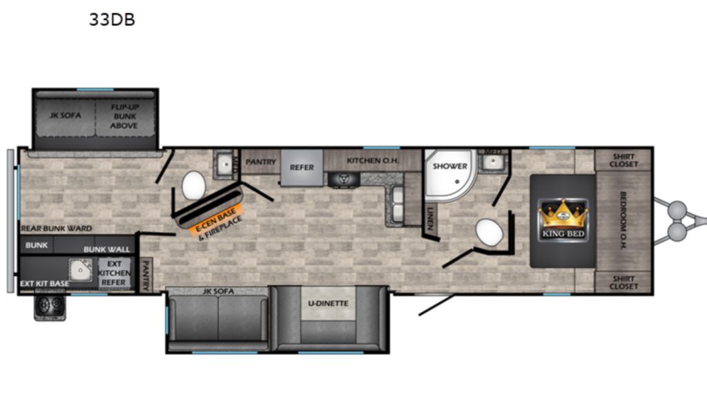 But that's not all! The Volante 33DB is packed with features to enhance your travel experience. From the stylish interior finishes to the practical storage solutions, every detail has been thoughtfully considered. Whether you're hitting the open road for a weekend escape or embarking on a cross-country journey, this travel trailer is ready to make your adventures unforgettable. Don't miss out on the chance to own this fantastic RV—it's your ticket to freedom and fun on the road!