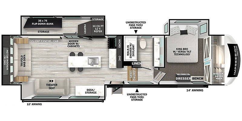 The 2024 Forest River Impression 318RLVIEW also boasts a luxurious master bedroom with plenty of storage, ensuring you can bring along all your essentials. The additional sleeping areas are equally comfortable, making sure everyone gets a good night's sleep. With its thoughtful design and high-quality finishes, this RV is built to provide an exceptional travel experience. Whether you're planning a weekend getaway or an extended road trip, the Impression 318RLVIEW is ready to make your journey unforgettable. Don't miss out on the opportunity to own this incredible fifth wheel and start making memories today!