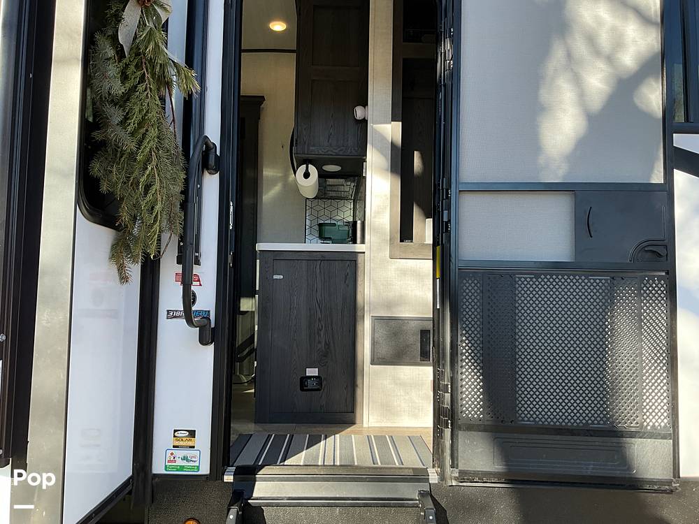Measuring approximately 32 feet in length, this fifth wheel offers ample space for relaxation and entertainment. Inside, you'll find a beautifully appointed living area with plush seating and a state-of-the-art entertainment system, making it the perfect spot to unwind. The fully equipped kitchen features top-of-the-line appliances, including a refrigerator, stove, and microwave, allowing you to prepare delicious meals with ease. The dining area is both stylish and functional, providing a great setting for family meals or game nights.