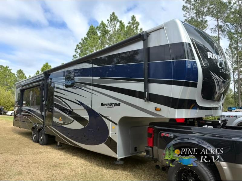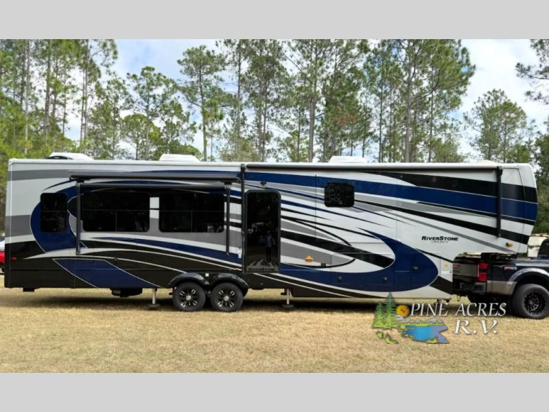 Step inside and you'll find four slide-outs that create an expansive living space, perfect for entertaining or just kicking back after a day of exploring. The RiverStone 39RKFB comfortably sleeps four, making it ideal for family trips or a getaway with friends. The interior is designed with modern elegance in mind, featuring high-end finishes and all the amenities you could wish for. Whether you're whipping up a meal in the fully-equipped kitchen or relaxing in the cozy living area, you'll feel right at home.