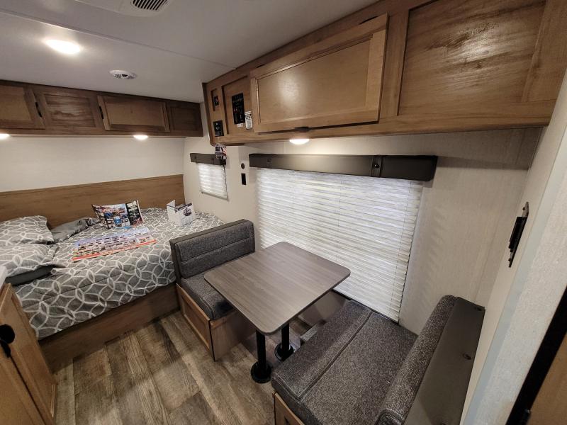 Inside, you'll find all the amenities you need for a comfortable journey. The kitchenette is equipped with a refrigerator, a two-burner cooktop, and a microwave, allowing you to prepare delicious meals on the go. The dinette area is perfect for enjoying meals or playing games, and it easily converts into an additional sleeping space. With its modern interior design and high-quality finishes, the Wolf Pup 14CC ensures that you travel in style. Whether you're exploring national parks or relaxing by the beach, this travel trailer is your home away from home. Don't miss the chance to own this versatile and reliable travel companion—start your adventure today with the 2024 FOREST RIVER Wolf Pup 14CC!