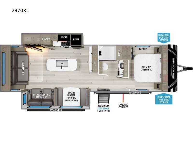 Inside, you'll find a cozy and inviting interior that's perfect for unwinding after a day of exploring. The well-equipped kitchen makes meal prep a breeze, and the comfortable seating area is ideal for movie nights or just kicking back with a good book. Whether you're a seasoned traveler or new to the RV lifestyle, the 2024 Grand Design Imagine 2970RL is designed to make every journey enjoyable. Don't miss out on the chance to own this fantastic travel trailer—it's your ticket to unforgettable adventures!