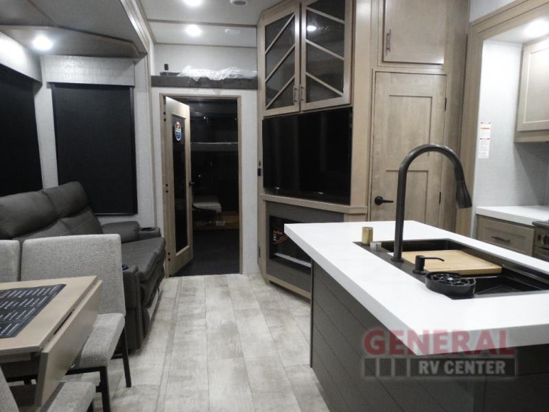 Step inside, and you'll be greeted by a spacious interior featuring three slide-outs that create an open and inviting living area. Whether you're lounging after a day of adventure or hosting friends, you'll appreciate the thoughtful design and high-quality finishes. The Momentum 397THS comfortably sleeps four, making it ideal for small families or couples who enjoy having a little extra room. The well-equipped kitchen and cozy living space make it feel like a home away from home.