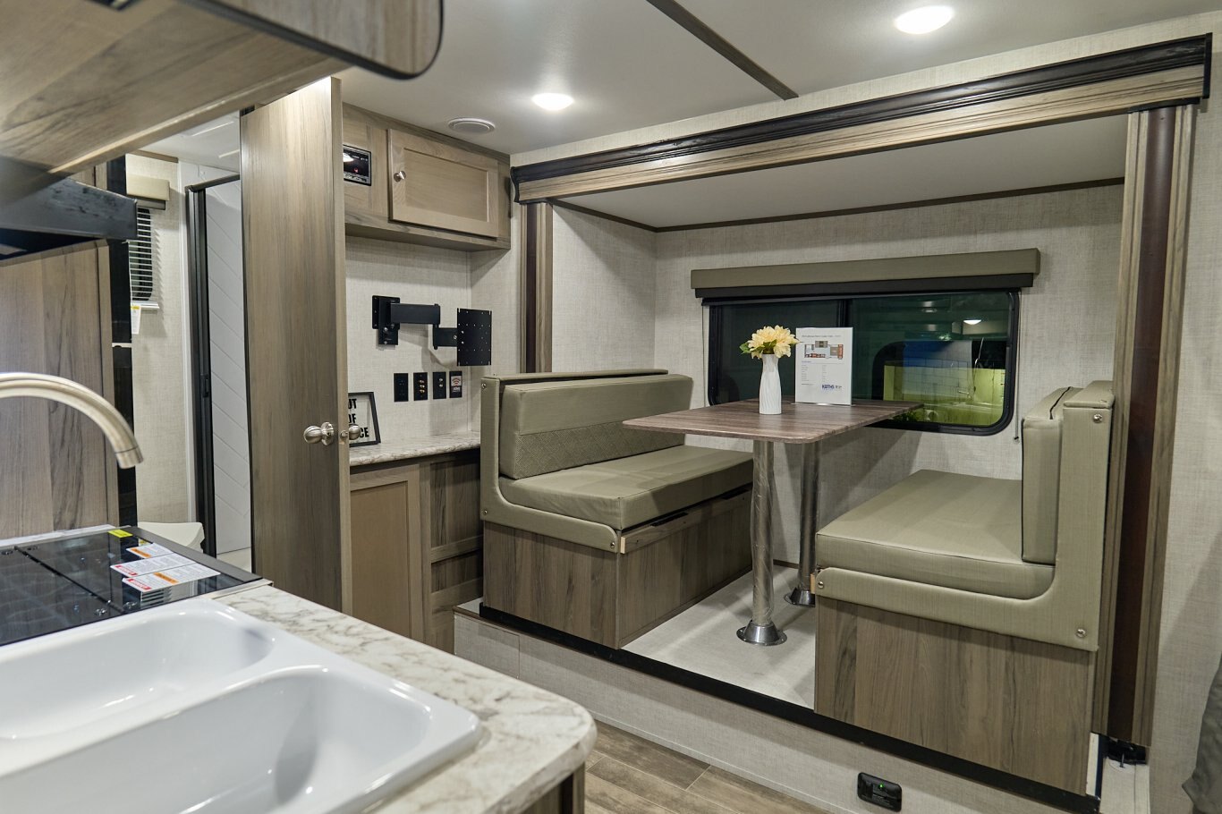 Inside, the Gulf Stream Matrix S 21QBD is thoughtfully designed to maximize space and functionality. The interior boasts a well-appointed kitchen equipped with a refrigerator, microwave, and a two-burner stove, all crafted to meet your culinary needs while on the road. The dining area comfortably seats four, providing a cozy setting for meals and gatherings. The sleeping quarters feature a queen-sized bed, ensuring restful nights after a day of adventure. Additionally, the RV includes a full bathroom with a shower, offering the convenience of home wherever your travels take you.