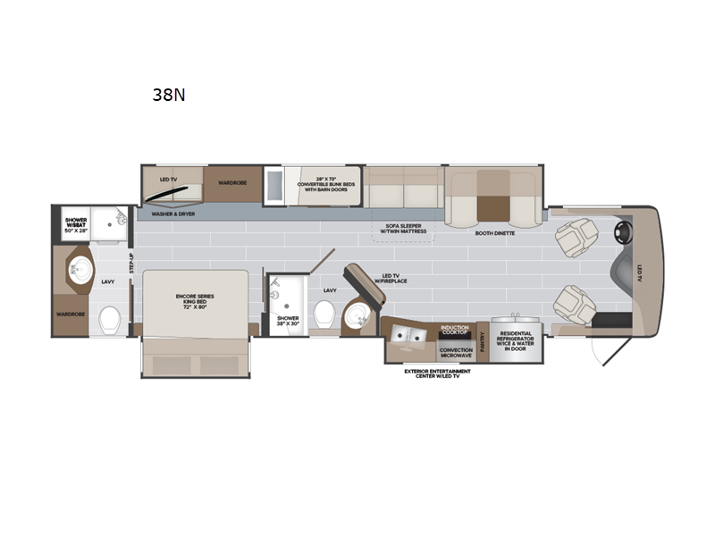 Step inside and be amazed by the expansive interior, featuring three slide-outs that create a roomy and inviting atmosphere. The Endeavor 38N comfortably sleeps up to eight people, making it ideal for family vacations or group getaways. The well-appointed kitchen, complete with modern appliances, allows you to prepare delicious meals on the go, while the cozy living area provides the perfect space to relax and unwind after a day of adventure.