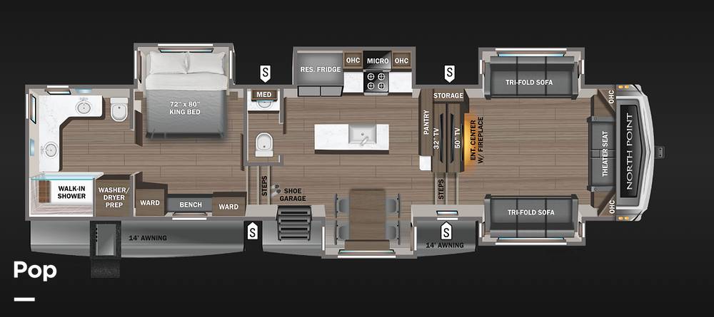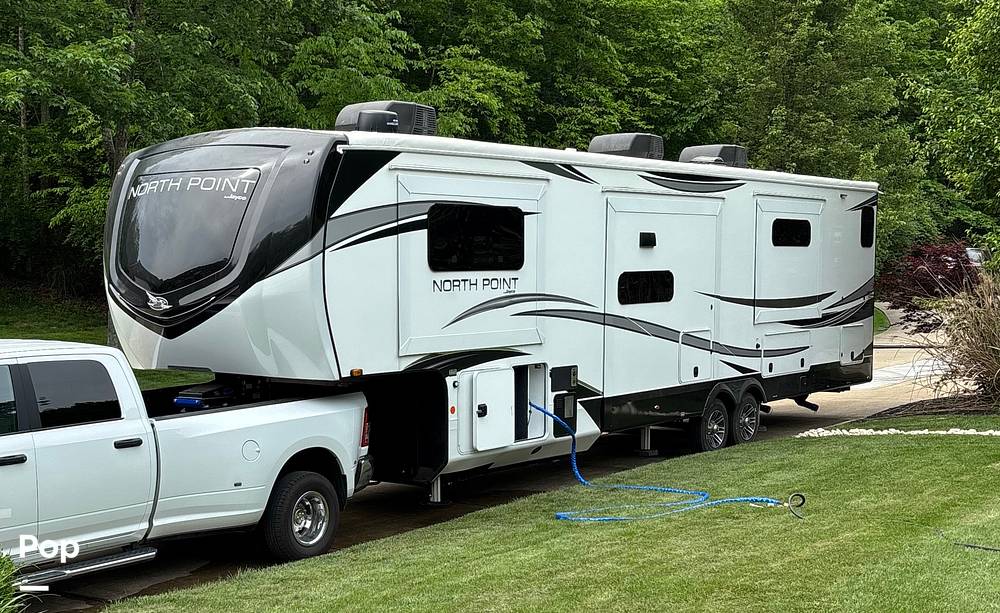 The sleeping arrangements are equally impressive, with a master bedroom offering a king-size bed and additional sleeping spaces that include convertible sofas and bunks. The bathroom is spacious and well-appointed, featuring a large shower and premium fixtures. Outside, the RV boasts a sleek design with durable construction, ensuring reliability and ease of towing. With the 2024 Jayco North Point 382 FLRB, every journey becomes an adventure in comfort and style. Don't miss the opportunity to own this exceptional fifth wheel and create unforgettable memories with your loved ones.