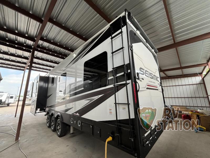 Measuring an impressive 37 feet in length, the Seismic 3815 provides ample space for relaxation and entertainment. Inside, you'll find a beautifully appointed interior with high-end finishes and modern amenities. The kitchen is equipped with top-of-the-line appliances, ensuring you can prepare delicious meals on the road. The living area features plush seating and a state-of-the-art entertainment system, perfect for unwinding after a day of adventure.