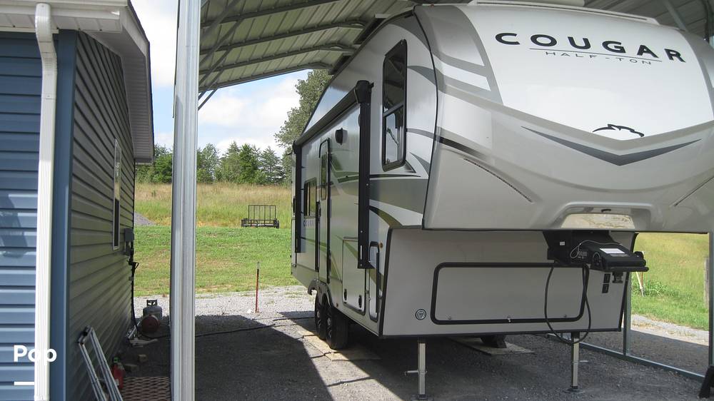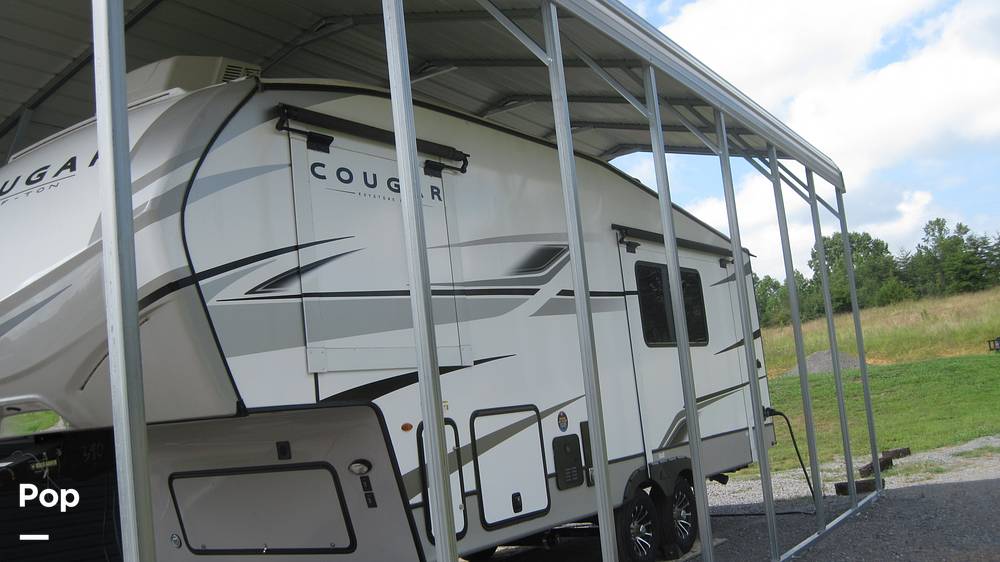 Inside, you'll find a thoughtfully designed living area that maximizes space without compromising on comfort. The Cougar 23MLE features a fully equipped kitchen with modern appliances, including a refrigerator, microwave, and stove, ensuring you can prepare meals with ease. The dining area is perfect for family meals or game nights, while the cozy seating area provides a relaxing space to unwind after a day of exploration. The sleeping arrangements are versatile, with a master bedroom offering a queen-sized bed, and additional sleeping options available in the convertible sofa and dinette area.