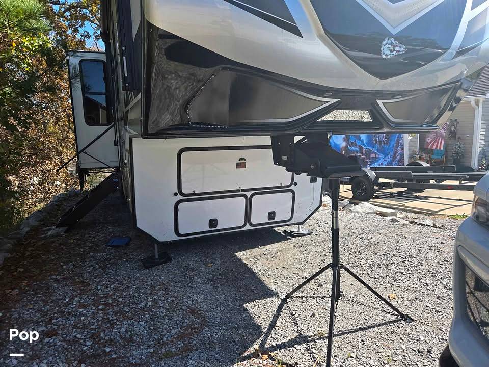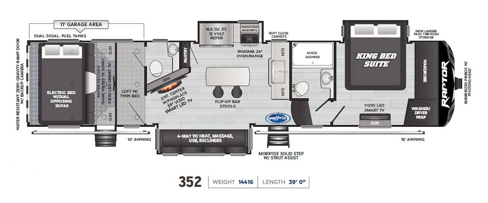 Beyond its elegant interior, the Keystone Raptor 415 is engineered for performance and reliability. Its robust construction and advanced technology provide a smooth and secure ride, while the exterior boasts ample storage compartments for all your travel essentials. Whether you're embarking on a cross-country journey or a weekend getaway, this travel trailer promises an unparalleled experience, combining the freedom of the open road with the comforts of home. Embrace the adventure and make lasting memories with the 2024 Keystone Raptor 415.