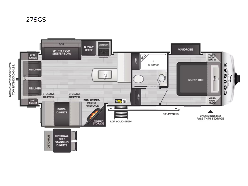 Step inside to find a thoughtfully designed interior that maximizes every square meter of space. The Cougar Half-Ton 27SGS features a modern kitchen equipped with high-quality appliances, including a refrigerator, microwave, and stove, ensuring you can prepare your favorite meals on the go. The living area boasts comfortable seating and a large flat-screen TV, perfect for relaxing after a day of exploration. The master bedroom offers a cozy queen-sized bed, ample storage, and a tranquil atmosphere for restful nights.
