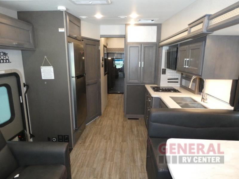 Step inside, and you'll find a spacious interior featuring two convenient slide-outs that expand your living area, making it perfect for family trips or entertaining friends. With the ability to sleep up to 8 people, this RV ensures everyone has a cozy spot to rest after a day of adventure. The well-designed layout includes a fully-equipped kitchen, a comfortable lounge area, and a luxurious sleeping quarters, providing all the comforts of home while you're on the road.