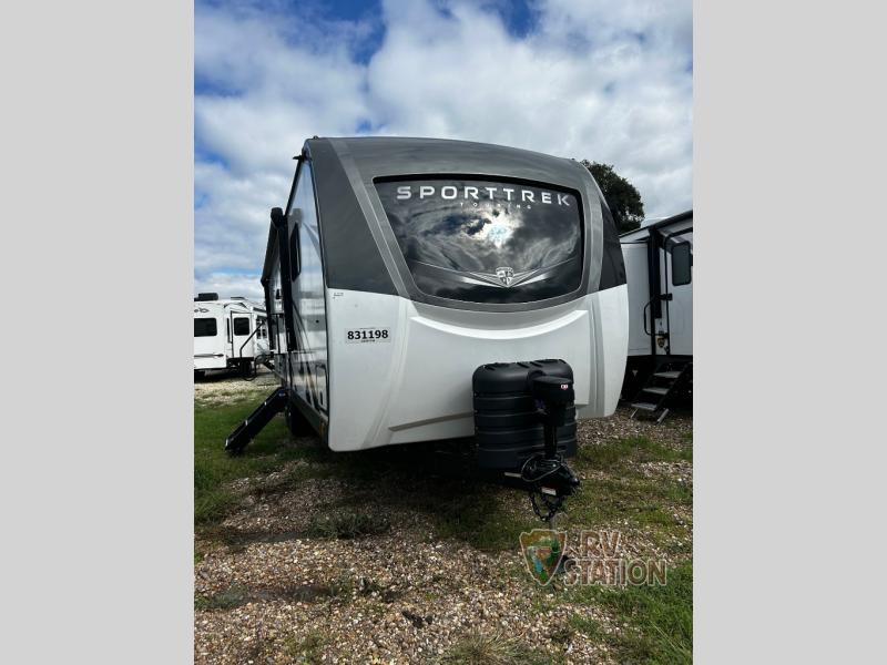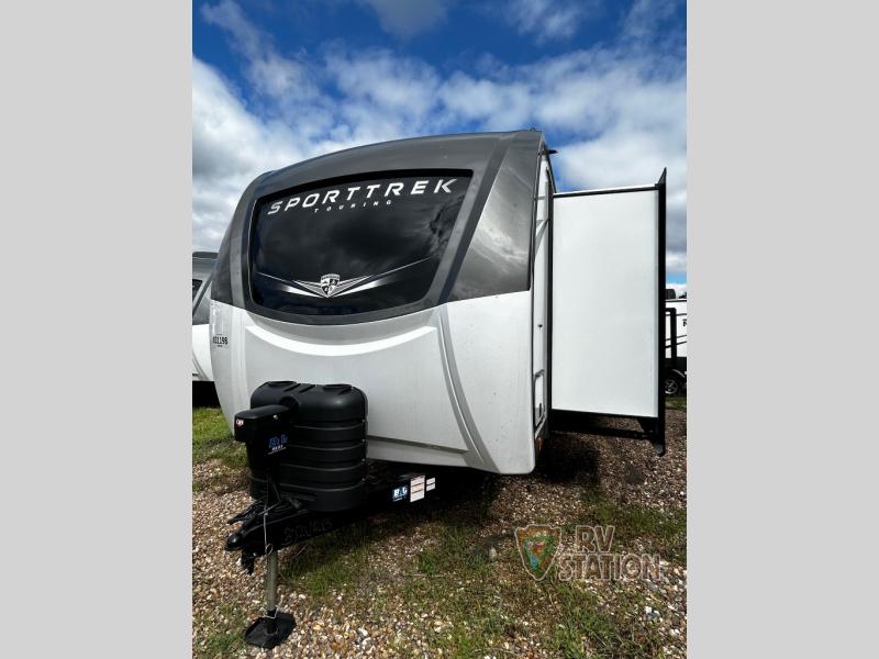 Measuring approximately 27 feet in length, the SportTrek Touring Edition is designed to maximize space without compromising on maneuverability. Its robust construction supports a weight of 3,455 kilograms, making it a durable and reliable choice for long-haul travels. The interior is thoughtfully designed to accommodate up to four people comfortably, offering a perfect blend of privacy and communal space. Whether you're embarking on a weekend getaway or an extended road trip, this travel trailer is equipped to meet your needs.