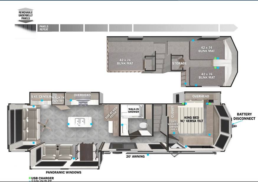 Inside, the Wildwood Grand Lodge 42DL is thoughtfully designed to accommodate up to six individuals, ensuring ample space for relaxation and rest. The interior boasts a sophisticated layout, featuring high-quality furnishings and state-of-the-art amenities. The living area is equipped with plush seating, perfect for unwinding after a day of exploration, while the fully-equipped kitchen offers all the essentials for preparing gourmet meals on the go. The sleeping quarters are designed with comfort in mind, providing a restful retreat with cozy bedding and ample storage solutions.