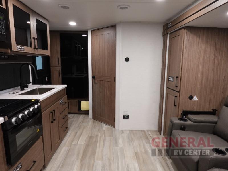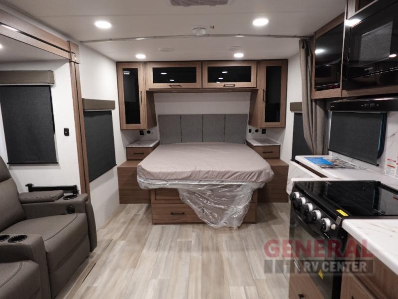 This travel trailer features one convenient slide-out, expanding your living space to create a cozy and inviting environment. Inside, you'll find a well-appointed interior that comfortably sleeps two, offering a restful retreat after a day of exploration. The intelligent layout maximizes space, providing a functional kitchen, a comfortable sleeping area, and a stylish bathroom, all designed with high-quality materials and finishes.