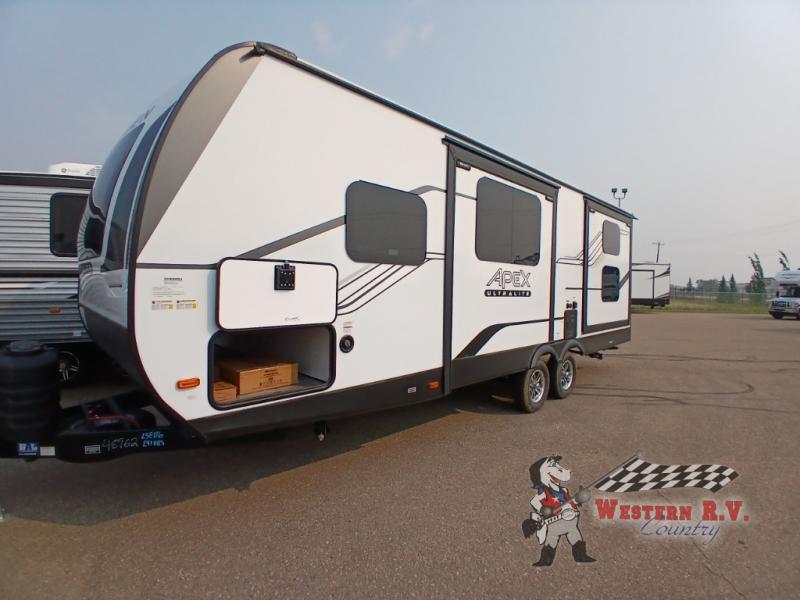The Apex Ultra-Lite 241BHS features two strategically designed slide-outs, maximizing interior space and providing a roomy atmosphere for relaxation and entertainment. This travel trailer comfortably accommodates up to four people, making it ideal for small families or couples seeking adventure. The interior is thoughtfully designed with high-quality materials and finishes, ensuring a cozy and inviting environment. The kitchen is equipped with modern appliances, while the living area offers ample seating and storage options, enhancing your travel experience.