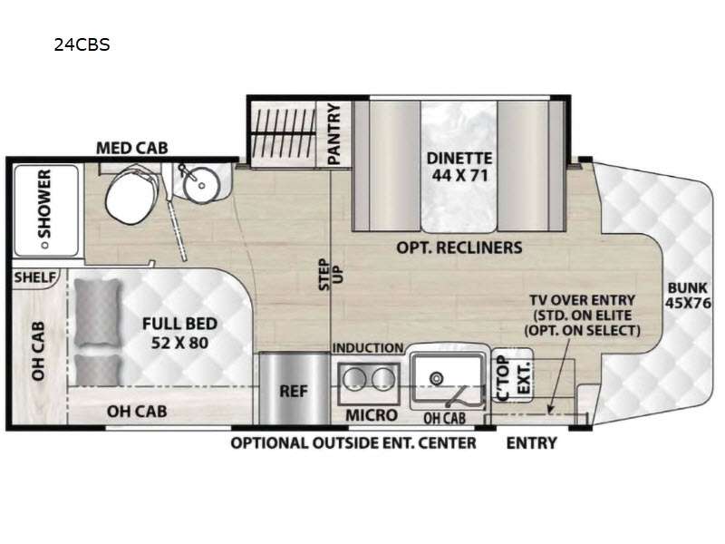 The Prism Select 24CBS comfortably sleeps up to five people, making it ideal for family trips or getaways with friends. Inside, you'll find a well-appointed interior featuring modern amenities and thoughtful design elements. The kitchen is equipped with everything you need to prepare meals on the go, while the cozy sleeping areas ensure a restful night's sleep. The RV's intelligent use of space means you have all the comforts of home, no matter where the road takes you.