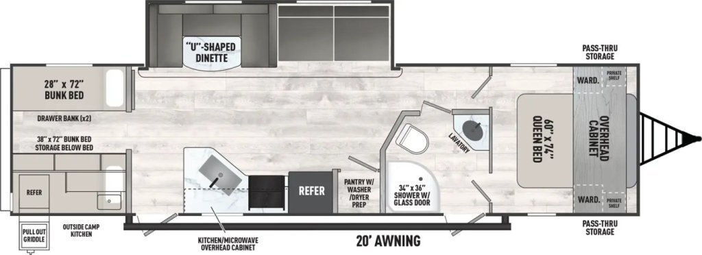 Inside, you'll find a spacious and thoughtfully designed interior that maximizes every centimeter of its 9-meter length. The RV features a fully equipped kitchen with a refrigerator, microwave, and a three-burner stove, ensuring you can prepare meals with ease. The living area is designed for relaxation, with comfortable seating and a dining space that converts into an additional sleeping area. The master bedroom offers a cozy queen-sized bed, while the bunkhouse provides ample sleeping space for children or guests. The bathroom includes a shower, sink, and toilet, ensuring all your needs are met on the road.