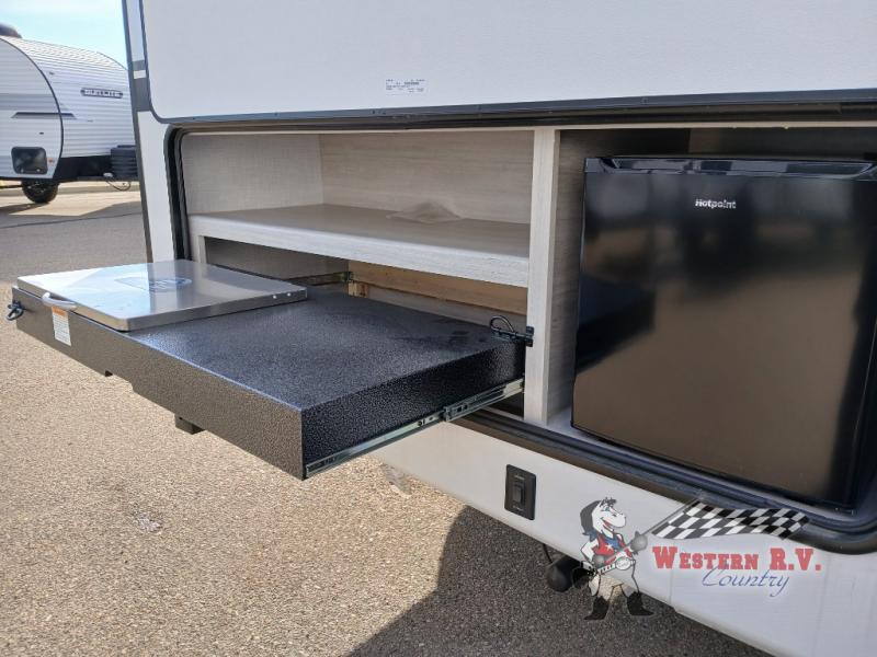 Step inside to discover a thoughtfully designed interior that maximizes comfort and convenience. The Sunset Trail SS279BH features a spacious living area with a modern entertainment system, ensuring relaxation after a day of exploration. The fully equipped kitchen boasts high-quality appliances, including a refrigerator, microwave, and three-burner stove, all seamlessly integrated into a sleek design. The dining area comfortably seats the whole family, making it ideal for shared meals and memorable conversations.