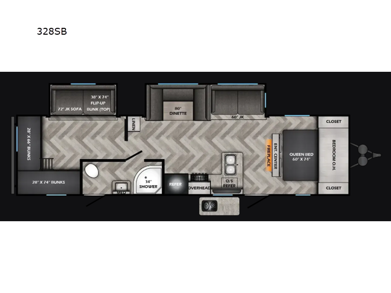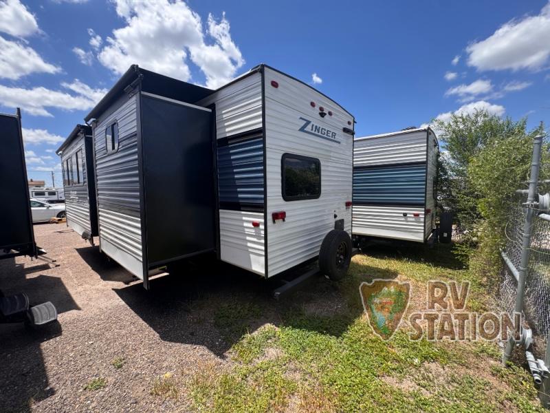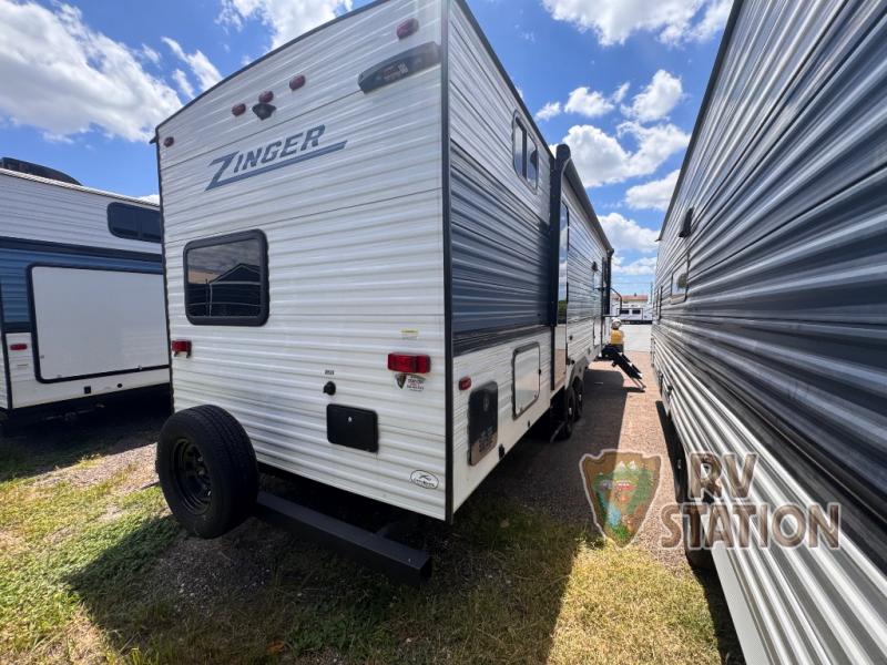 This travel trailer features two slide-outs, significantly enhancing the living space and providing a roomy interior that can comfortably accommodate up to 11 people. The intelligent design of the Zinger 328SB includes a well-appointed kitchen, a cozy living area, and multiple sleeping arrangements, ensuring everyone has their own space to relax and unwind. The thoughtful layout is perfect for large families or groups of friends, offering both privacy and communal areas for socializing.