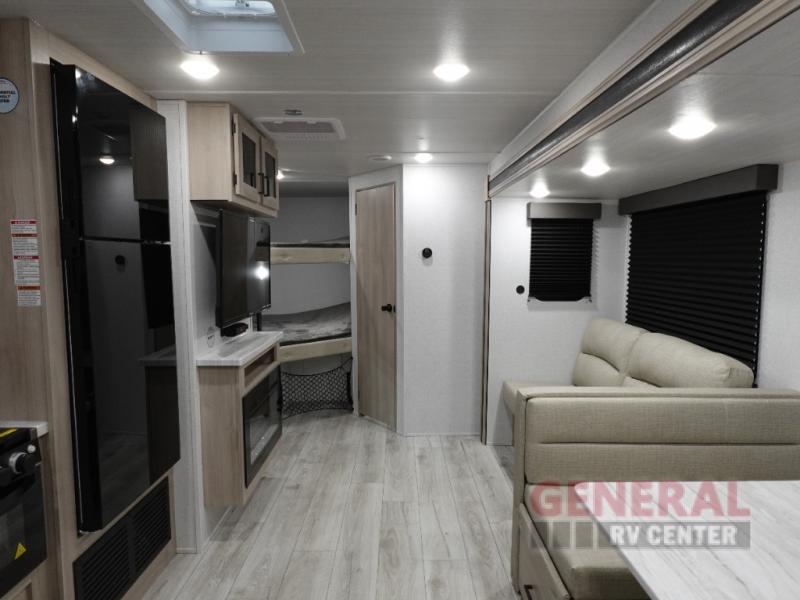 Inside, you'll find sleeping accommodations for up to 8 people, making it ideal for families or groups of friends. The thoughtfully designed layout includes a comfortable queen bed, double bunk beds, and convertible dinette and sofa beds, ensuring everyone has a restful night's sleep. The modern kitchen is equipped with all the essentials, including a refrigerator, microwave, and stove, so you can whip up delicious meals on the go. Plus, the spacious bathroom with a shower ensures you have all the comforts of home, no matter where you roam.