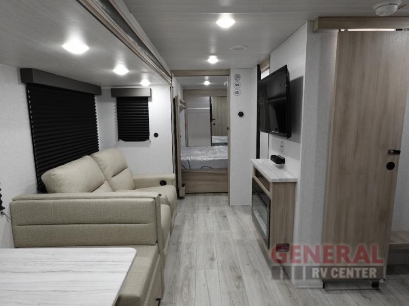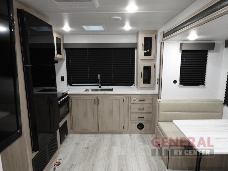 Step inside and experience the thoughtfully designed layout that comfortably sleeps up to four people. Whether you're embarking on a family getaway or a romantic retreat, this travel trailer ensures everyone enjoys a restful night's sleep. The well-appointed kitchen, complete with modern appliances and ample counter space, makes meal preparation a breeze, while the cozy living area provides the perfect setting for relaxation and entertainment after a day of exploration.