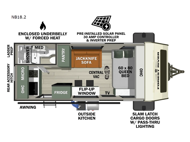 Introducing the 2025 Forest River RV No Boundaries NB18.2 Travel Trailer, a perfect blend of compact design and modern amenities, tailored for the adventurous spirit. This travel trailer is meticulously crafted to cater to the needs of small families or couples seeking a comfortable and convenient travel experience. With a length of 18 feet, this RV is designed to navigate through diverse terrains with ease, making it an ideal choice for those who love to explore the great outdoors without compromising on comfort.