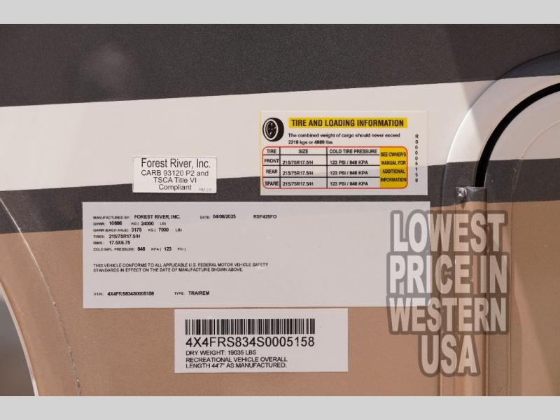 Weighing in at approximately 8,377 kilograms, this fifth wheel is built for stability and ease of towing. Its robust construction and innovative design make it a reliable companion on the road. Whether you're exploring the great outdoors or enjoying a weekend getaway, the 2025 Forest River RV RiverStone 425FO promises a journey filled with comfort, style, and unforgettable memories. Don't miss the opportunity to own this exceptional RV and embark on your next adventure in unparalleled luxury.