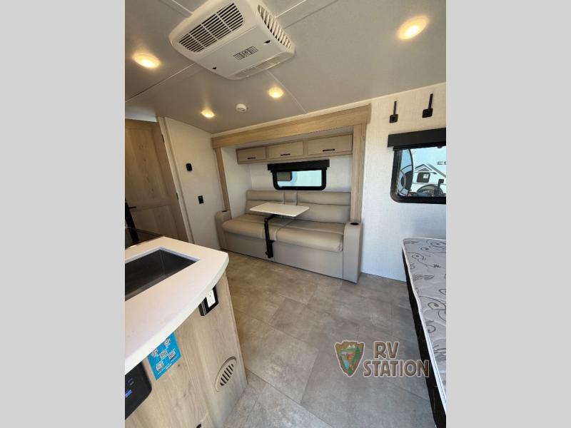 Inside, you’ll find a cleverly designed space that can comfortably sleep up to three people. The single slide-out expands the living area, giving you extra room to relax after a day of exploring. The interior is modern and stylish, with all the amenities you need for a cozy getaway. Whether you’re whipping up a meal in the well-equipped kitchen or unwinding in the comfy sleeping area, this RV has you covered.