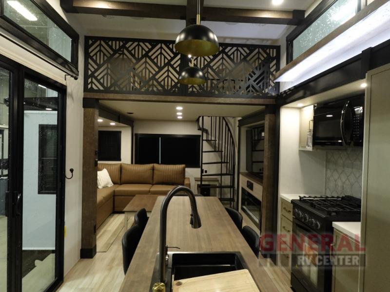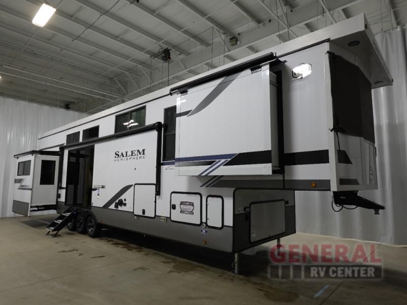 The Salem Hemisphere ROOST43 features five strategically designed slide-outs, maximizing the living area and creating a spacious environment that can comfortably sleep up to seven people. Whether you're embarking on a weekend getaway or an extended road trip, this RV is equipped to meet all your needs. The interior boasts high-quality finishes and modern appliances, providing a home-like atmosphere on the road. The thoughtful layout includes a fully equipped kitchen, a cozy living area, and a well-appointed bathroom, ensuring that every aspect of your travel experience is catered to with precision and care.
