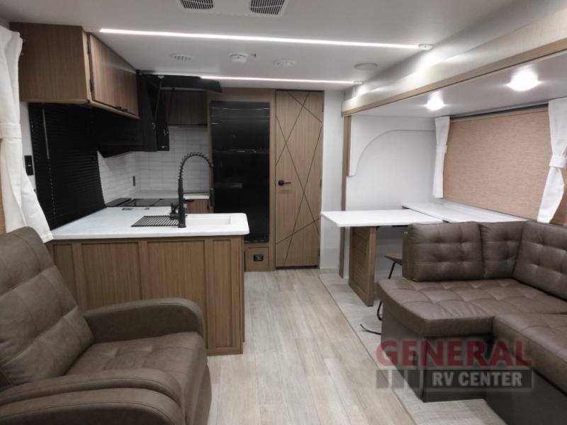 Inside, you’ll find a cleverly designed layout that maximizes space and functionality. The single slide-out expands your living area, providing extra room to relax and unwind. Whether you’re planning a romantic getaway or a family trip, this RV comfortably sleeps four, making it perfect for couples or small families. The rear kitchen is a standout feature, offering ample counter space and modern appliances to whip up your favorite meals on the go.