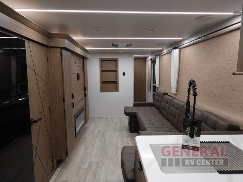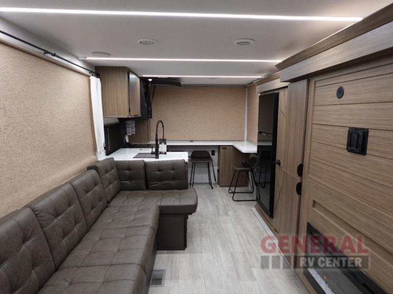 The Wildwood 29VIEW features a single slide-out that expands your living area, providing a spacious and inviting environment for relaxation and entertainment. Inside, you'll find accommodations to comfortably sleep up to four people, making it perfect for small families or couples looking to explore the great outdoors. The interior is thoughtfully designed with high-quality materials and finishes, ensuring a cozy and welcoming atmosphere. The well-equipped kitchen, complete with modern appliances, allows you to prepare meals with ease, while the dining area offers a comfortable space to enjoy them.