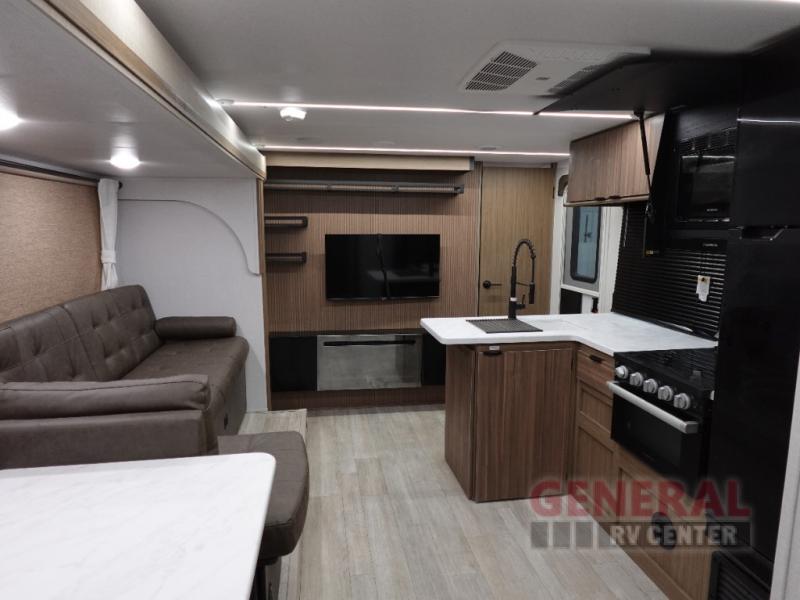 Inside, you’ll find a cleverly designed layout that can sleep up to 9 people, making it ideal for family getaways or trips with friends. The single slide-out expands your living space, giving you more room to relax and enjoy your time on the road. Whether you’re lounging after a day of exploring or gathering for a meal, this RV has you covered. The interior is both stylish and functional, with plenty of storage options to keep your space tidy and organized.