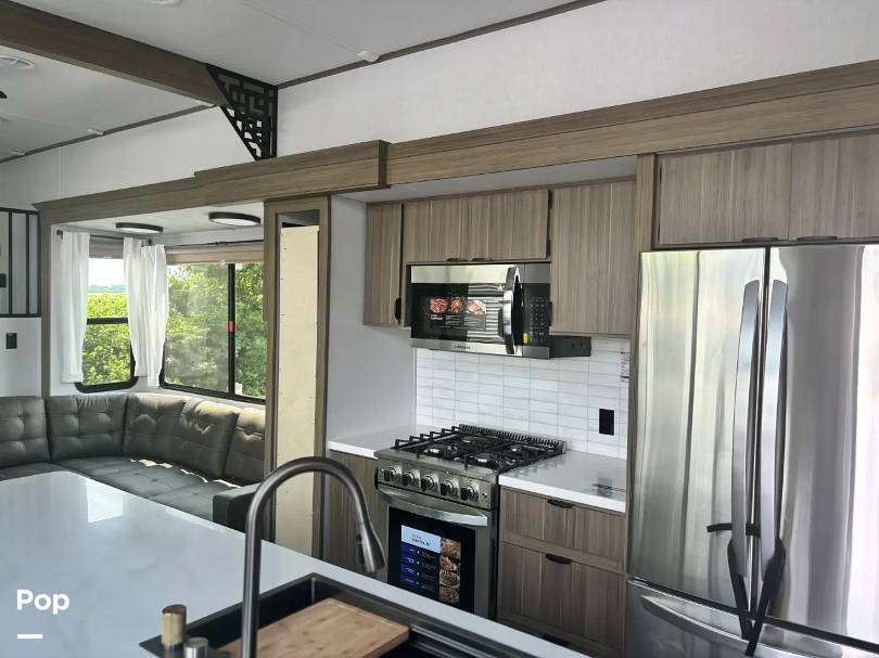 Step inside to discover a thoughtfully designed living area, featuring modern amenities and stylish finishes. The open floor plan includes a fully equipped kitchen with state-of-the-art appliances, making meal preparation a breeze. The cozy living room invites you to unwind with its plush seating and large windows that provide panoramic views of your surroundings. The sleeping quarters are equally impressive, offering comfortable beds and plenty of storage to keep your belongings organized.