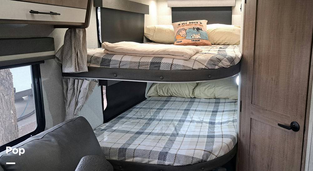 Step inside to discover a thoughtfully designed interior that maximizes space and functionality. The M-25DBE features a cozy sleeping arrangement with a queen-sized bed, double bunk beds, and a convertible dinette, ensuring everyone has a comfortable place to rest after a day of adventure. The fully equipped kitchen boasts a refrigerator, microwave, and three-burner stove, allowing you to prepare delicious meals on the go. The bathroom includes a shower, sink, and toilet, providing all the conveniences of home.