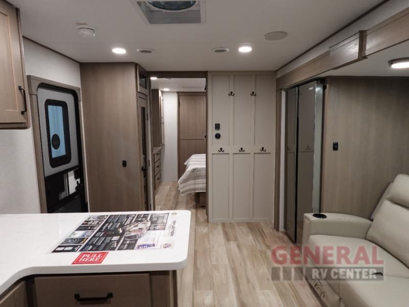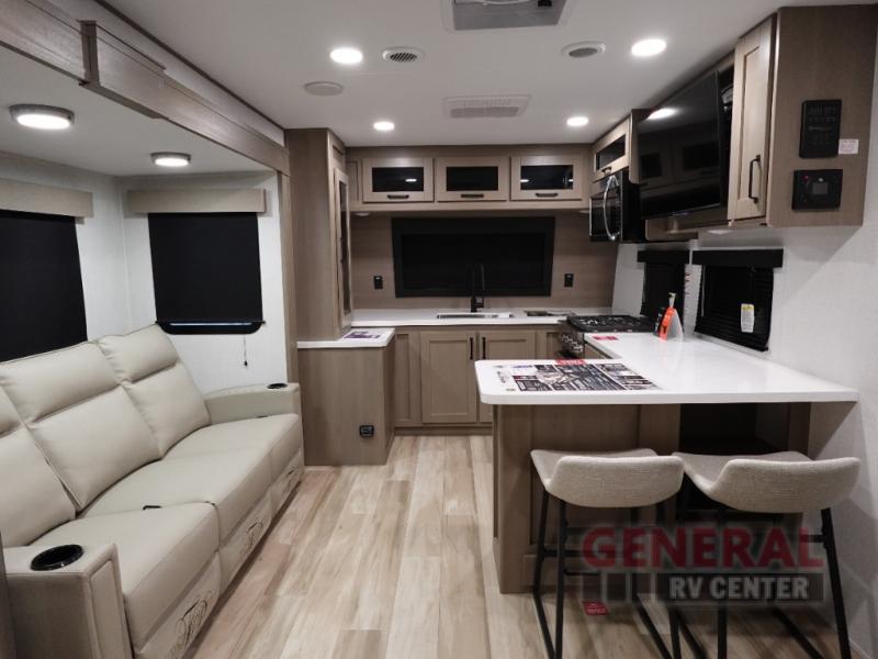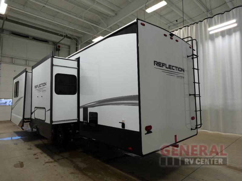 The Reflection 322FKTS features two slide-outs, enhancing the living area to provide a spacious and inviting environment. Inside, you'll find a well-appointed interior that sleeps two comfortably, ensuring a restful night's sleep after a day of exploration. The modern kitchen is equipped with top-of-the-line appliances and ample storage, making meal preparation a breeze. The elegant living area is perfect for relaxation, featuring plush seating and state-of-the-art entertainment options.