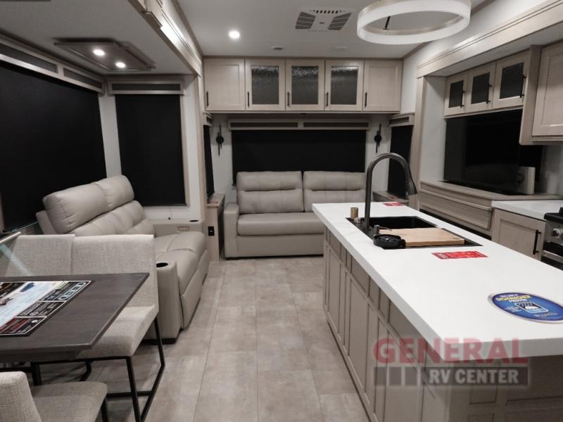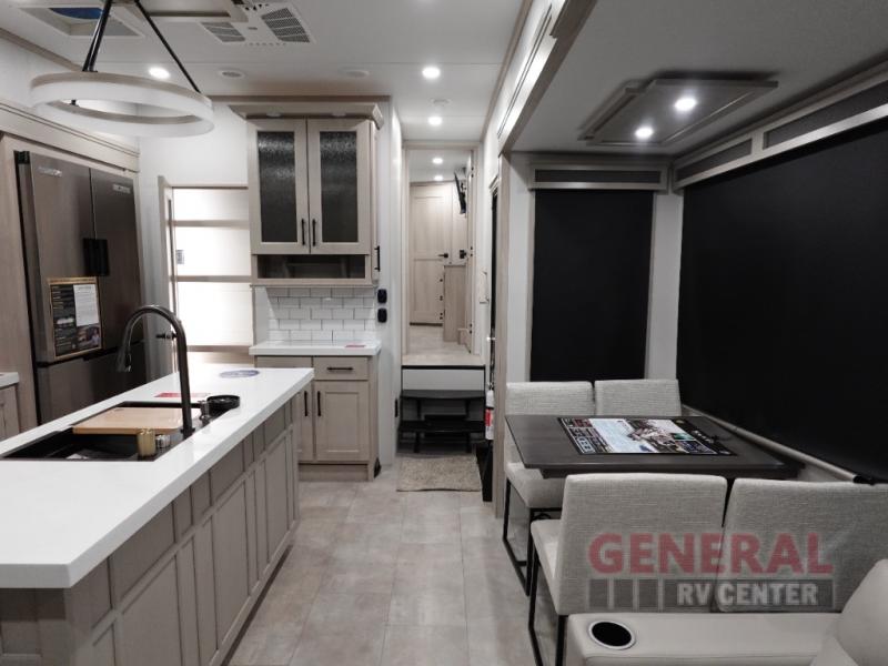 Measuring an impressive 28 feet in length, the Solitude 310GK is crafted to provide a cozy yet spacious environment. It comfortably sleeps up to four people, making it ideal for family getaways or a couple's retreat. The interior is thoughtfully designed with high-quality finishes, including plush seating, a fully equipped kitchen, and a luxurious bathroom, ensuring every journey is as comfortable as possible. The RV's weight of approximately 5,927 kilograms ensures a stable and smooth ride, allowing you to travel with peace of mind.
