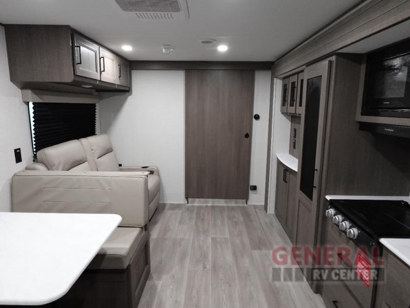 Step inside to find a welcoming interior that comfortably sleeps up to three people, making it ideal for couples or small families. The single slide-out expands your living space, offering a roomy area to relax and unwind. The well-appointed kitchen is equipped with everything you need to whip up delicious meals on the go, while the inviting dining area is perfect for enjoying them. The trailer's smart design ensures that every inch is utilized efficiently, providing ample storage for all your travel essentials.