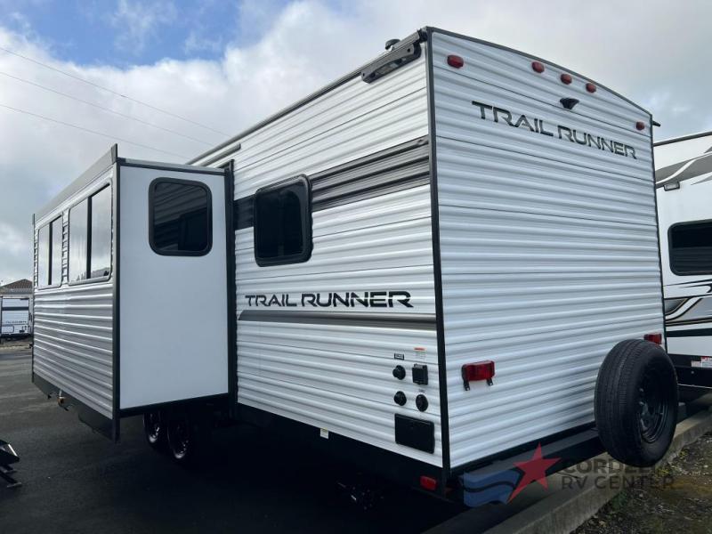 Inside, you'll find a thoughtfully designed layout that can comfortably sleep up to eight people. The single slide-out expands the living area, providing extra room for relaxation and entertainment. Whether you're enjoying a meal at the dinette, lounging on the sofa, or getting a good night's sleep in one of the cozy sleeping areas, you'll appreciate the attention to detail and quality craftsmanship throughout. The Trail Runner 31DB ensures everyone has their own space, making it perfect for family trips or adventures with friends.