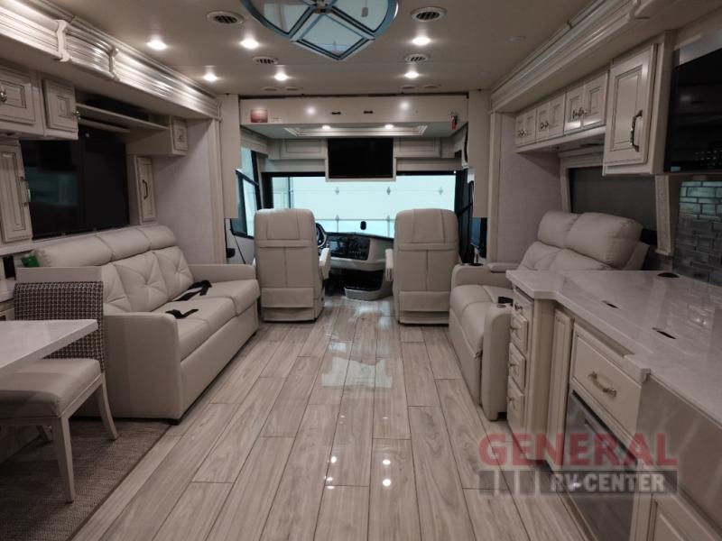 Measuring 33 feet in length, this RV offers a spacious interior that feels more like a cozy home than a vehicle. The well-appointed living area includes plush seating and a state-of-the-art entertainment system, ensuring relaxation after a day of exploration. The kitchen is equipped with modern appliances and ample storage, making meal preparation a breeze. The sleeping quarters are designed for comfort, with a master suite and additional sleeping options to accommodate everyone on board.