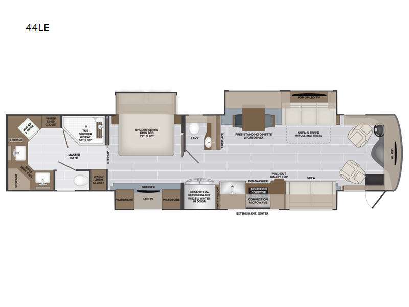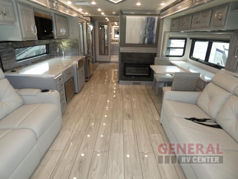 The Armada 44LE features three strategically designed slide-outs, maximizing the interior space to create a spacious and inviting living environment. Accommodating up to six people, this RV is ideal for family trips or group excursions. The well-appointed interior boasts premium materials and finishes, ensuring a luxurious experience for all occupants. The fully equipped kitchen, elegant dining area, and plush seating arrangements make it easy to entertain guests or enjoy quiet evenings with family.