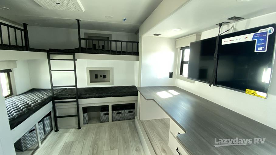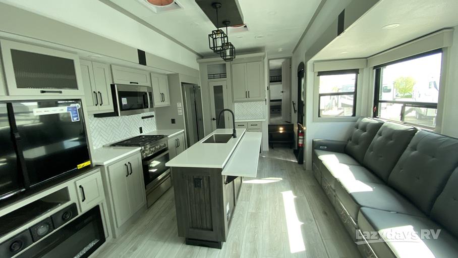 The Montana High Country 397FB features three strategically placed slide-outs, significantly enhancing the living space and providing a roomy atmosphere that can comfortably accommodate up to eight guests. The interior is thoughtfully designed with high-quality finishes and modern amenities, ensuring a luxurious experience on the road. The sleeping arrangements are versatile and include plush bedding options, making it perfect for family trips or hosting friends. The RV's intelligent layout maximizes space and functionality, offering a seamless blend of style and practicality.
