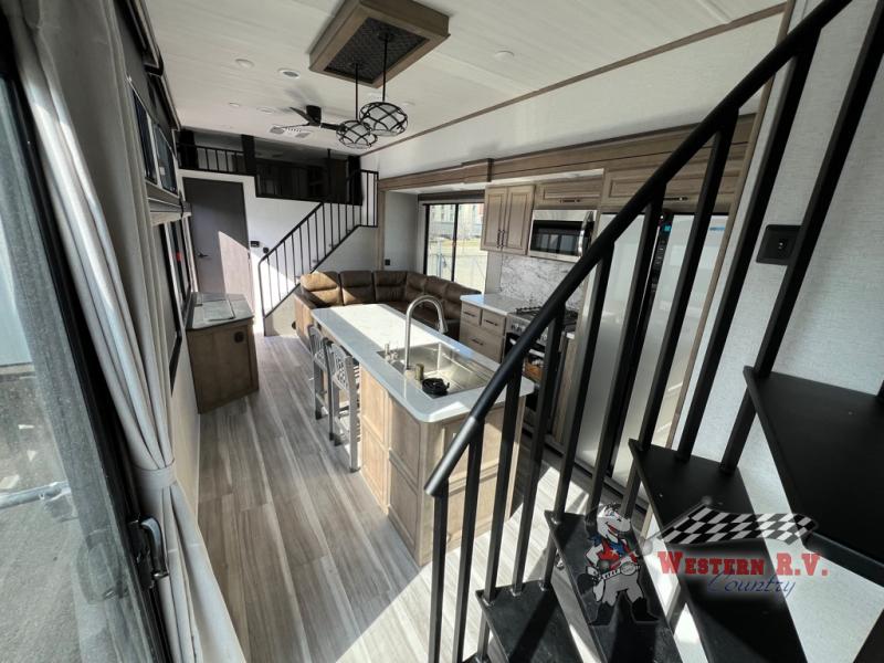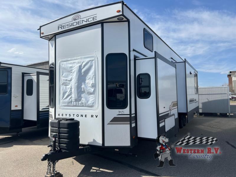 The Keystone RV Residence 401HBDL is engineered for convenience and comfort, accommodating up to eight people with ease. Whether you're planning a family getaway or a trip with friends, this RV provides ample sleeping arrangements to suit your needs. The intelligently designed interior includes a fully equipped kitchen, a cozy living area, and a luxurious bathroom, ensuring that every journey is as comfortable as possible. With a weight of approximately 5,848 kilograms, this RV is robust yet easy to tow, making it perfect for both seasoned travelers and RV newcomers.