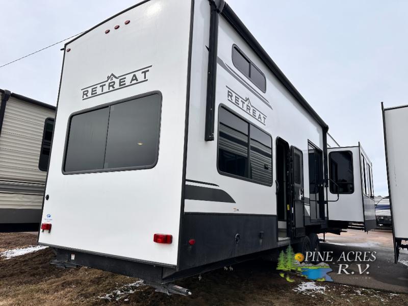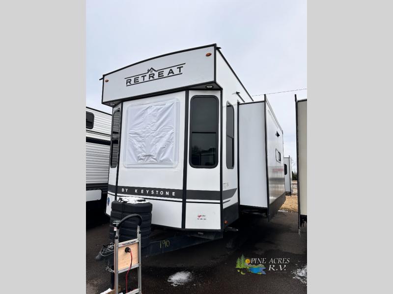 Introducing the 2025 Keystone RV Retreat 391FSRL, a luxurious Park Model designed for those who crave comfort and style on the road. This spacious RV stretches an impressive 40 feet in length, offering ample room for relaxation and entertainment. With its modern design and high-quality finishes, the Retreat 391FSRL is perfect for families or groups looking to enjoy the great outdoors without sacrificing the comforts of home.